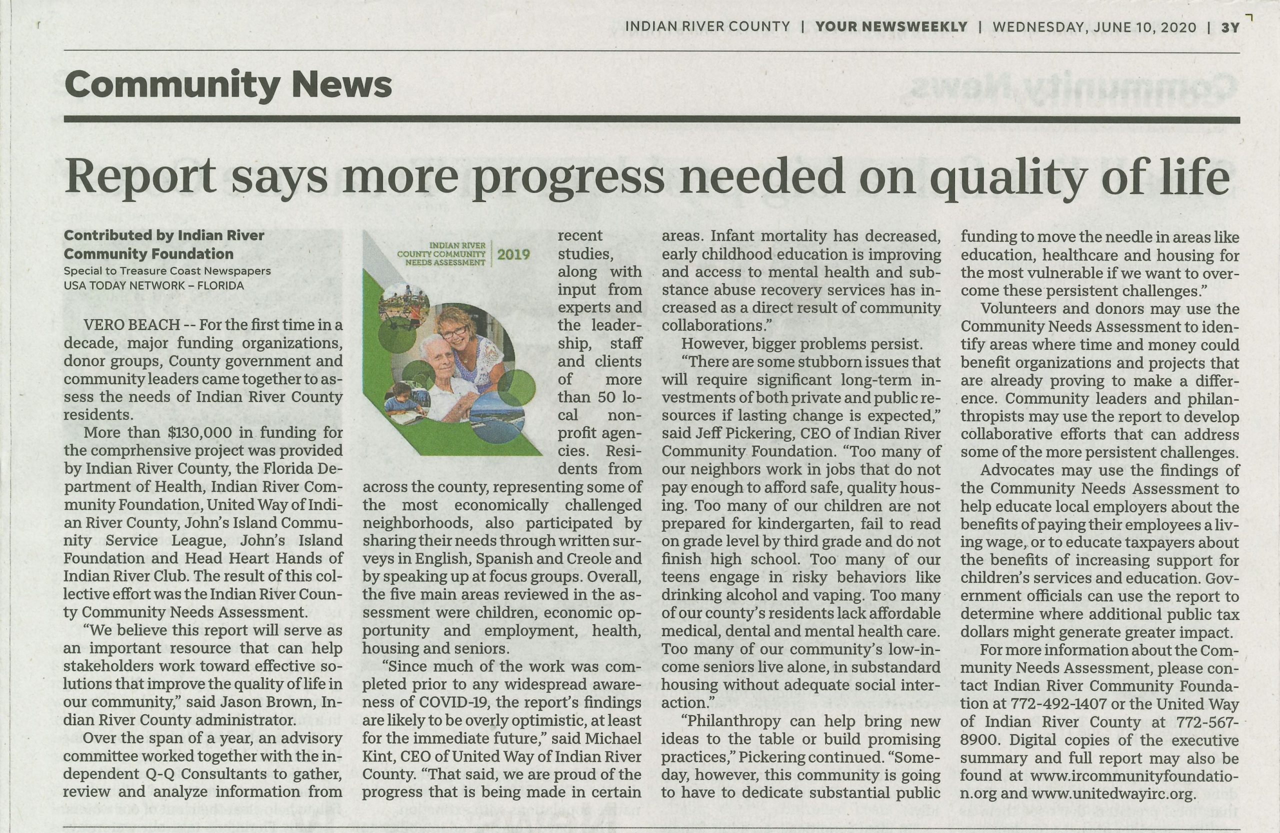 For the first time in a decade, major funding organizations, donor groups, County government and community leaders came together to assess the needs of Indian River County residents on a comprehensive basis. More than $130,000 in funding for the project was provided by Indian River County, the Florida Department of Health, Indian River Community Foundation, United Way of Indian River County, John’s Island Community Service League, John’s Island Foundation and Head Heart Hands of Indian River Club. The result of this significant collective effort is the Indian River County Community Needs Assessment.