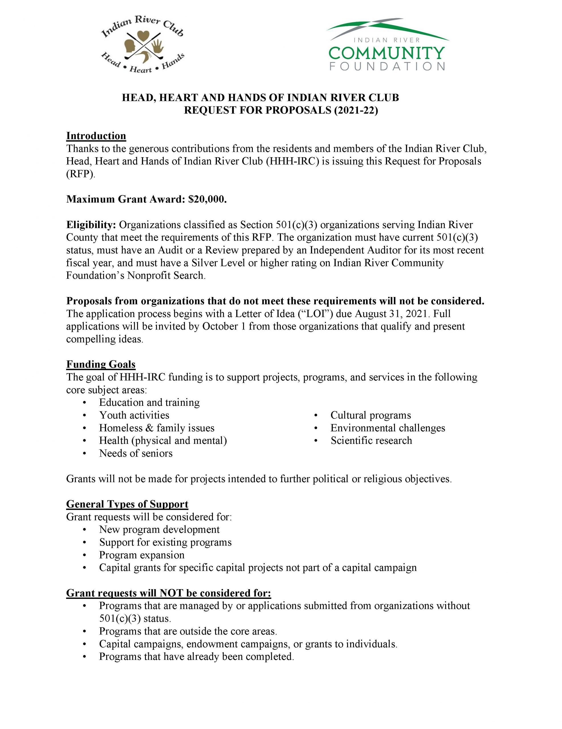 Letters of Idea are reviewed for eligibility and competitive qualities by Community Foundation staff. Full grant applications are reviewed by a committee comprised of Indian River Community Foundation’s Board of Directors and other community members.