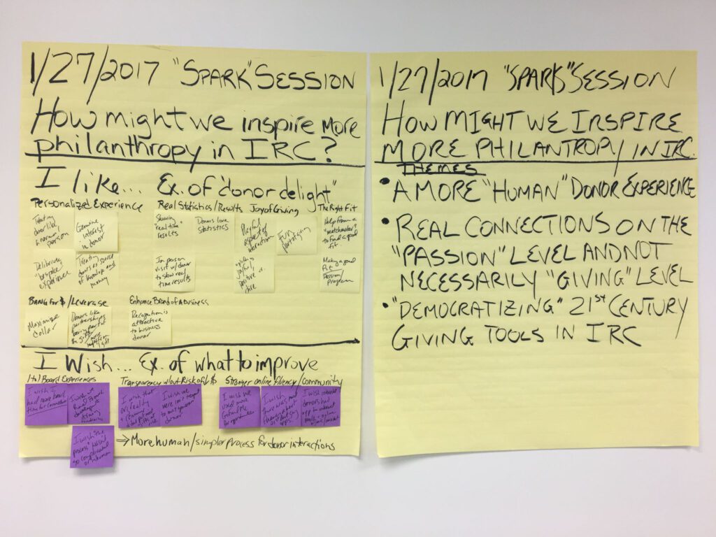 Sparks were flying at IRCF's first "Spark Session" thanks to the energetic participation of Judy Lemoncelli (Alzheimer and Parkinson Association of Indian River County), Hannah Trodglen (Homeless Children's Foundation) and Molly Steinwald (Environmental Learning Center). This one-hour idea lab was designed to generate ideas about how we might inspire more local giving here in Indian River County. Three meaningful themes emerged (pictured below), and we are interested in continuing the conversation next month. If you are a donor who has been "wowed" by your experience of giving to a local charity, or an employee or volunteer of a local charity who has witnessed a donor's "delight" after making a charitable contribution to your organization, then we want to hear from you. The next Spark Session will be held on February 24, 2017 from 8:30-9:30. Space is limited to 12 participants, and no solicitation will be permitted. Please RSVP to Yamilet Cendejas at yamilet@ircommunityfoundation.inri.staging.findsomewinmore.com.
